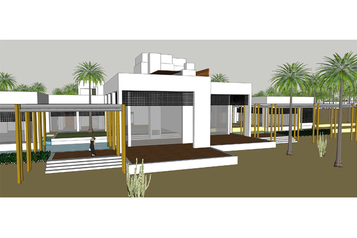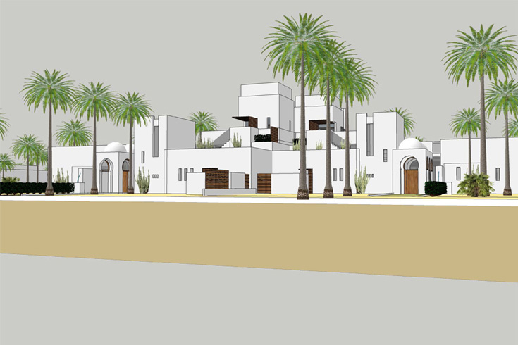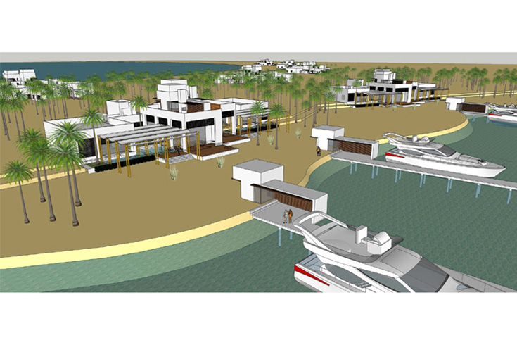 Four artificial islands are master planned to accommodate 100 luxury villas.  The villas are designed in a variety of layouts from 4-bedroom luxury suites to semi-detached single bedroom units, each with their own private beach and boat mooring.  The harsh climatic conditions of the desert are mitigated with the deep overhangs protecting the homes’ window areas. Howard Rideout is the chief designer of this project as a consultant to B+H Architects, Shanghai.