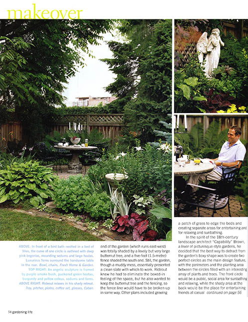 This garden is inspired by the spirit of 18th century landscape architect “Capability” Brown in a picturesque style design based around two perfect circles. The front circle in grass and lined with salvaged brick and the shady circle with decorative stone float within large planted perennial beds to fill the rectangular lot.